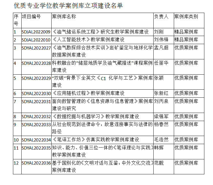 山东省研究生优质威廉希尔资源项目是《山东省专业学位研究生教育改革发展行动方案》中“基础要素建设专项行动”的重要建设内容,旨在全面加强专业学位研究生课程和案例库建设,完善以质量和应用为导向的课程建设机制,构建以学生为中心、案例为媒介、问题为起点、讨论为手段的专业学位案例教学机制,推动形成省级精品、省级优质、校级优秀的教学资源建设体系。根据专项行动建设目标,到2025年,将立项建设100门省级精品课程和案例库、500门省级优质课程和案例库。本次全省共立项建设省级优质研究生课程224项,其中精品课程23项,立项建设山东省优质专业学位教学案例库220项,其中精品案例库20项。