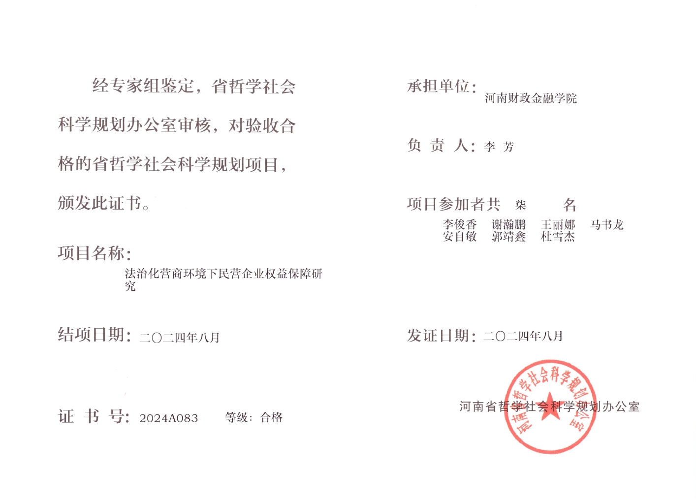 近日,法律硕士研究生安自敏、法学理论专业硕士研究生杜雪杰、郭靖鑫参与的省级课题《法治化营商环境下民营企业权益保障研究》顺利结项。该课题旨在深入探讨法治化营商环境对民营企业权益保障的影响,并提出相应的政策建议,为优化营商环境和保护民营企业权益提供理论支持。