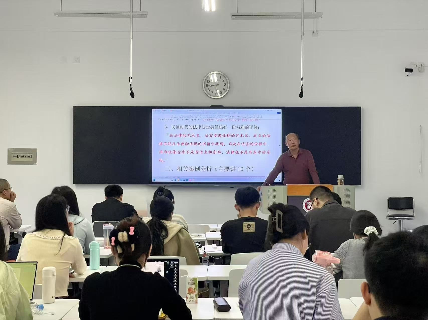 史彤彪教授围绕“法官应该做立法者的思想助手”展开报告,他分别从三个层面展开分析。第一个层面分析法官在法律在社会生活实现过程中的桥梁作用,涉及自然法学派、规范分析法学派、社会法学派的学者的论述,共同点在于都强调法官要创造性司法。第二个层面分析法国、瑞士民法典的相关规定。第三个层面结合国内外的真实案例、判例,予以进一步验证思想家和学者的思路的合理性。最后,他提出结论性的观点,即一个好的判决,要经得起价值、规范和事实三个角度的评判。针对学生提出的关于立法者的问题,史彤彪教授进行了细致的回应。通过这次学术报告,师生们拓宽了学术视野,受益匪浅。
