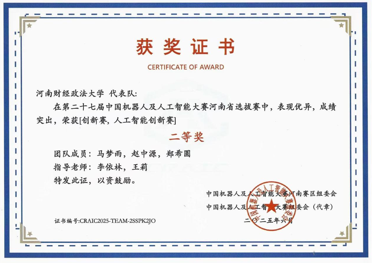 近日,中国机器人及人工智能大赛组委会公布了第二十七届中国机器人及人工智能大赛河南省选拔赛获奖名单,我院环境与资源保护法硕士研究生马梦雨、赵中源的参赛项目《环境保护AI法律数字人》荣获创新赛——人工智能创新赛二等奖并入围国赛。
