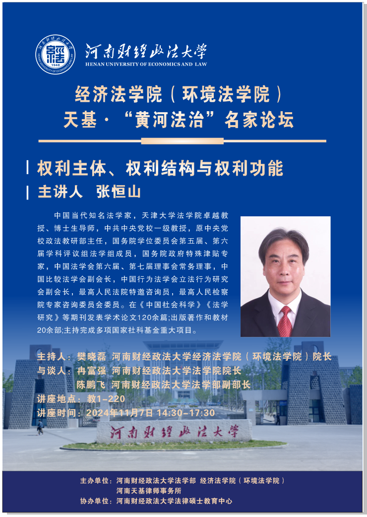 【讲座通知】天基·“黄河法治”名家论坛第一讲:权利主体、权利结构与权利功能——张恒山教授