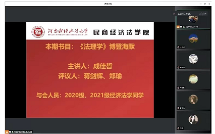 此次读书交流会中,民商法学专业的学生围绕康德的《纯粹理性评判》一书展开讨论,同学们从该书的历史背景、主要内容与主要观点进行了分享交流。经济法学专业的学生围绕博登海默的《法理学—法律哲学与法律方法》一书的核心观点相互分享读书感悟,深入学习体会法理学的奥妙。环境与资源保护法学专业的学生围绕《财产权利与制度变更》对财产制度进行讨论。